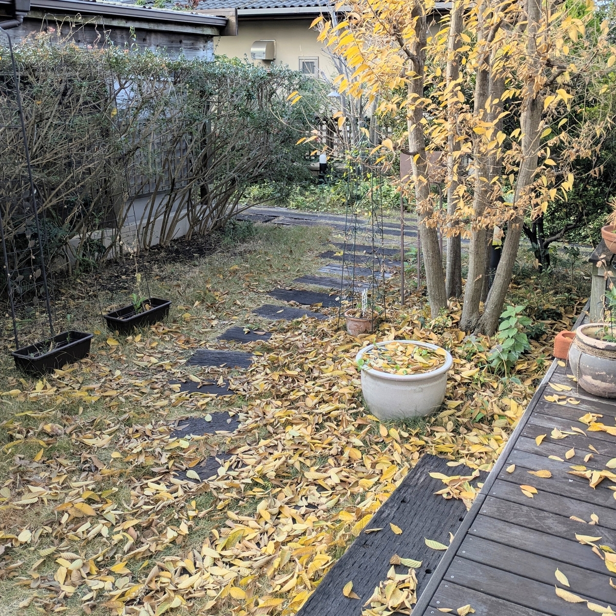 2~3日の間に雨が降り強い風が吹き荒れたら、落ち葉で庭が大変なことになった。
